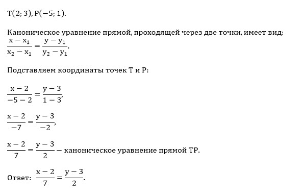 2. Написать каноническое уравнение прямой на плоскости, проходящей через точки Т(2;3) и Р(-5;1).