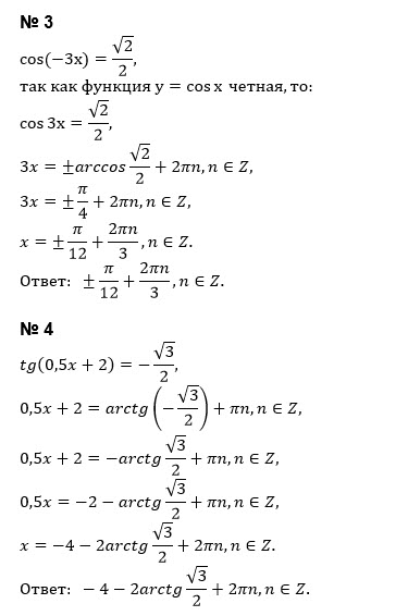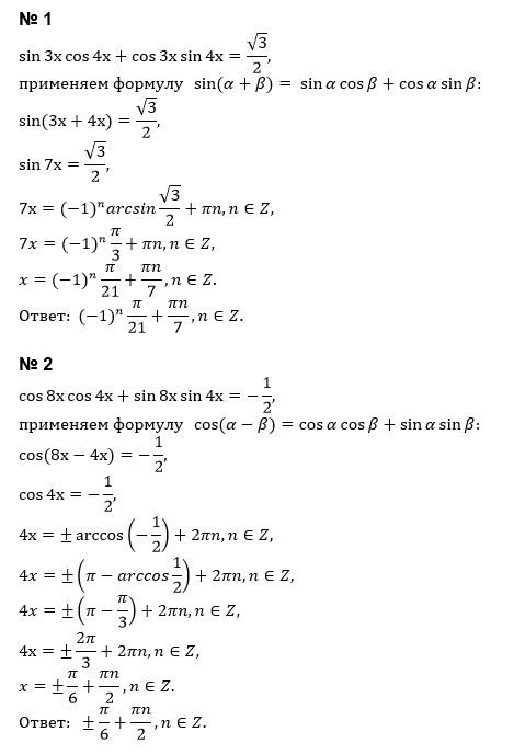 Помогите ❤️ 1)sin3x*cos4x+cos3x*sin4x=√3/2 2)cos8x*cos4x+sin8x*sin4x=-1/2 3)cos(-3x)=√2/2 4)tg(0,5x+2)=-√3/2 5)ctg(π/4-2x)=1