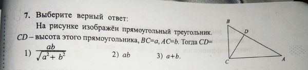 S_( Δ АВС)=(1/2)*АС*ВС ( половина произведения катетов) S_( Δ АВС)=(1/2)*АВ*СD ( половина произведения основания на высоту) [b](1/2)*АС*ВС=(1/2)*АВ*СD[/b] ⇒ CD=AC*BC/AB АВ=sqrt(a^2+b^2) CD=a*b/sqrt(a^2+b^2) О т в е т. 1)