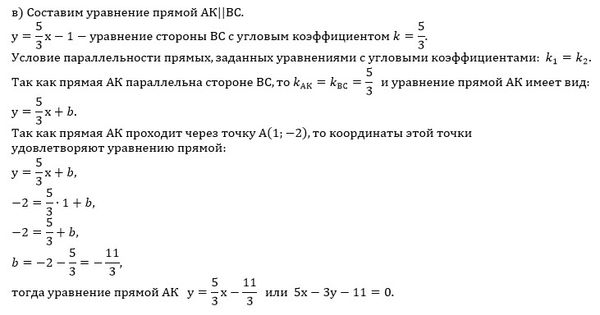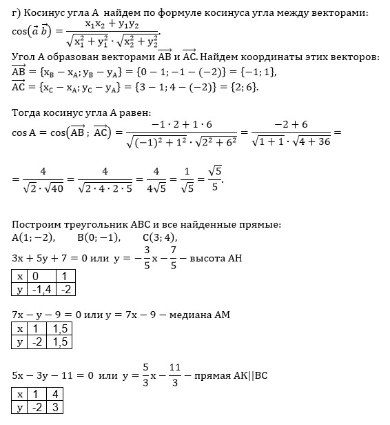 Даны вершины треугольника ABC . Найдите: а) уравнение высоты AH ; б) уравнение медианы AM ; в) уравнение прямой, проходящей через вершину A параллельно стороне BC ; г) косинус угла при вершине A . Постройте все прямые. 1.A(1;-2), В(0;-1), С(3;4).