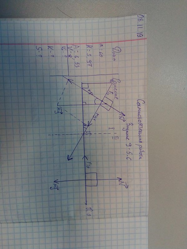 Тело начинает скользить с высоты (H) = 3,97, по наклонной плоскости с углом (a) = 60. Начальная скорость (V0) = ?. Ускорение при движении по наклонной плоскости (A) = 6,53, скорость у основания плоскости (V) = 8. После спуска тела проходит по горизонтали до остановки путь (S) = ?.Коэффициент трения на наклонном и горизонтальном участках (K) = ?.