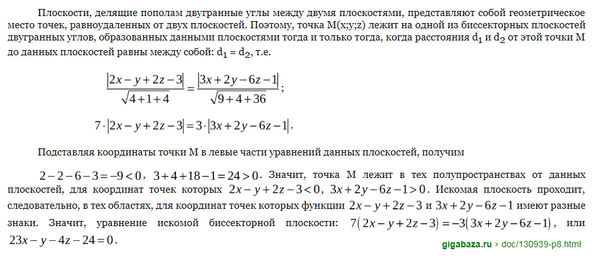 Составить уравнение плоскости, делящей пополам тот двугранный угол между двумя плоскостями P1 и P2: P1 : 2x − y + 2z − 3 = 0, P2 : 3x + 2y − 6z − 1 = 0, в котором лежит точка M(1,2,−3).