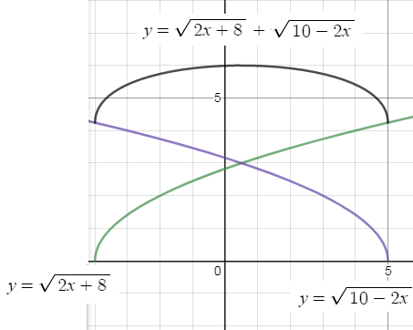 y=sqrt(2x+8)+sqrt(10-2x) принимает на [-4;5] значения
