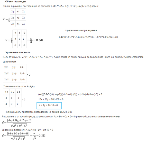Вычислить объем тетраэдра с вершинами в указанных точках и его высоту, опущенную из вершины А4 на грань А1 А2 А3 A1(4,2,5); A2(0,7,2); A3(0,2,7); A4(1,5,0);