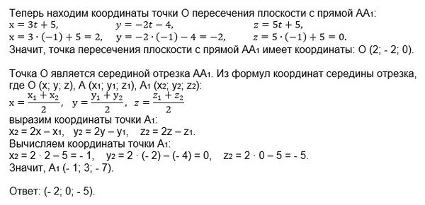 Найти точку, симметричную точке А(5;-4;5) относительно плоскости 3x-2y+5z-10=0
