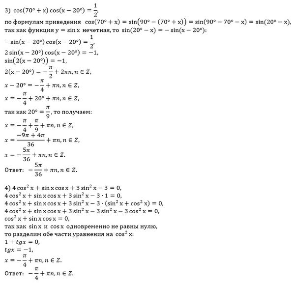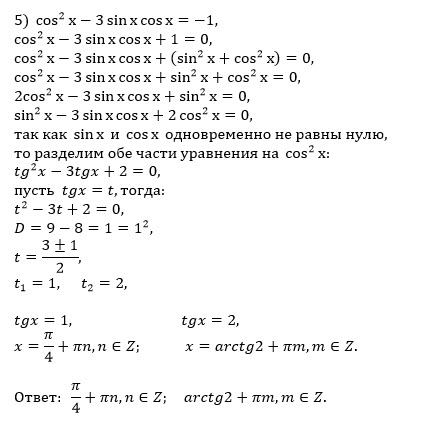 ПОМОГИТЕ ПОЖАЛУЙСТА , СРОЧНО Решите уравнение 1)sinx+sin5x-2cos2x=0; 2)cos5x+cosx+2cos3x=0; 3)cos(70°+x)cos(x-20°)=1/2; Решите однородное тригонометрическое уравнение 4)4cos^2x+sinxcosx+3sin^2x-3=0; 5)cos^2x-3sinxcosx=-1.