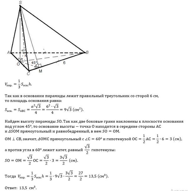 3.3. Основанием пирамиды является правильный треугольник со стороной 6 см. Одна боковая грань пирамиды перпендикулярна плоскости основания, а две другие наклонены к плоскости основания под углом 45°. Найдите объем пирамиды.