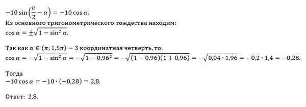 Найти -10sin(π/2-a), если sina=0,96 и а ∈ (π; 1,5π)