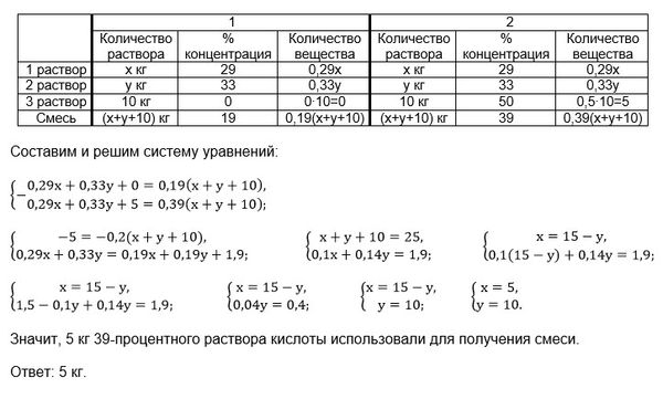 Если смешать 29-дроцентный раствор кислоты и 33-процевтный раствор этой же кислоты и добавить 10 кг чистой воды, получится 19-процентный раствор кислоты. Если бы вместо 10 кг воды добавили 10 кг 50-процентного раствора той же кислоты, то получили бы 39-процентный раствор кислоты. Сколько килограммов 29-процентного раствора использовали для получения смеси?