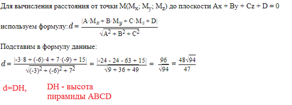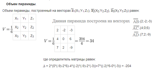 в перамиде A B C D с вергинами в точках А (1;2;0) В (3;0;-3) С(5;2;6 ) D(8;4;-9) найии объем и длину высру опущенной на грани ABC