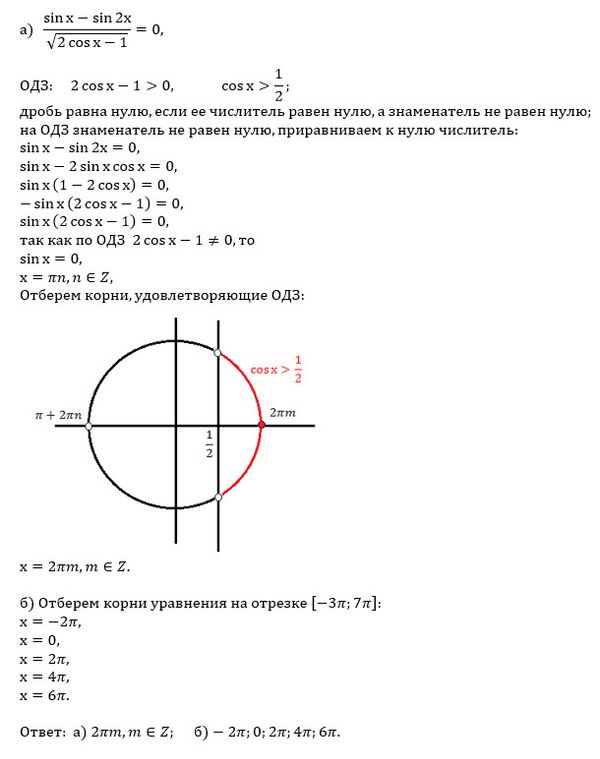 а) Решить уравнение [m]\frac{sinx-sin2x}{\sqrt{2cosx-1}} = 0[/m] б) Отобрать корни из отрезка [-3Pi; 7Pi]