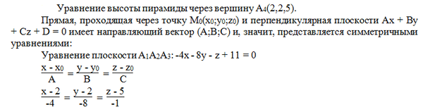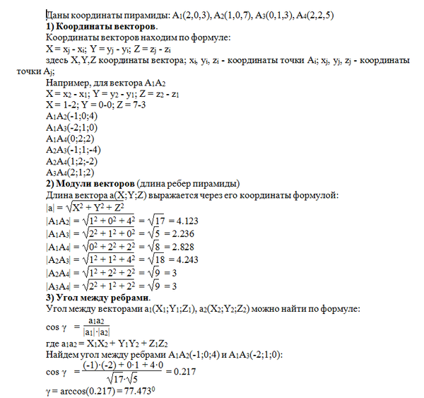 По координатам вершин пирамиды А1А2А3А4 найти: 1) длины ребер А1А2 и А1А3; 2) угол между ребрами А1А2 и А1А3; 3) площадь грани А1А2А3; 4) объем пирамиды; 5)высоту пирамиды, опущенную из вершины А4 на грань А1А2А3; 6) составить уравнение плоскости А1А2А3; 7) составить уравнение высоты, опущенной из точки А4 на плоскость А1А2А3;8) найти расстояние от точки А3 до плоскости А1А2А4.