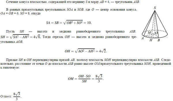 Радиус основания конуса равен 6, а его высота равна 8. Плоскость сечения содержит вершину конуса и хорду основания, длина которой равна 4. Найдите расстояние от центра основания конуса до плоскости сечения.