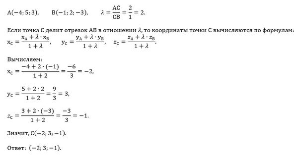 Найти координаты точки C, делящей отрезок AB в отношении 2:1, если A(−4,5,3),B(−1,2,−3) .