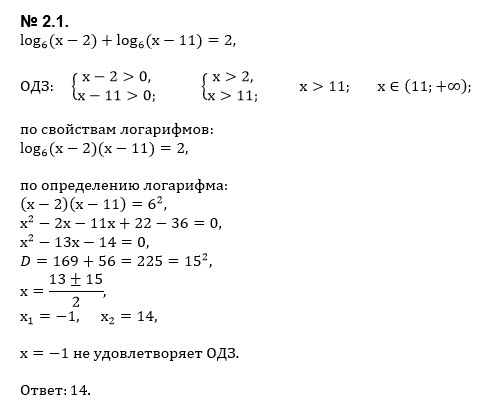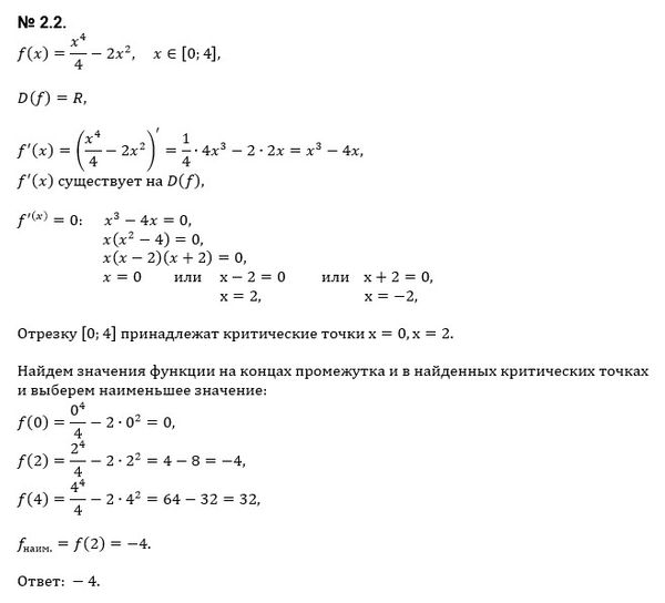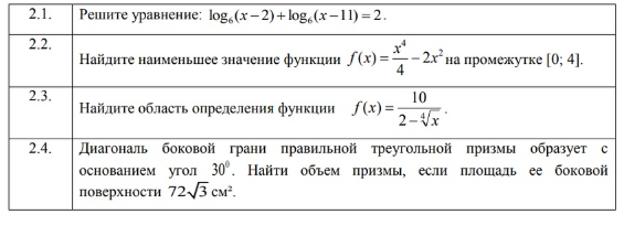 2.1. Решите уравнение: log8(x−2)+log8(x−11)=2. 2.2. Найдите наименьшее значение функции f (x)=x^4/4−2x^2 на промежутке [0;4].