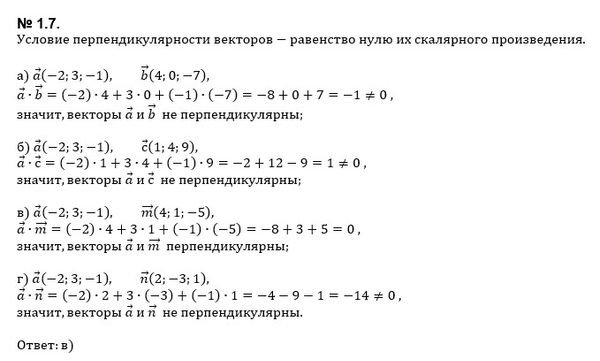 Угол между векторами равен 90, если скалярное произведение этих векторов равно 0. x1*x2+y1*y2+z1*z2=0 a(-2;3;-1) m(4;1;-5) -2*4+3*1+(-1)*(-5)=0 Ответ:в)