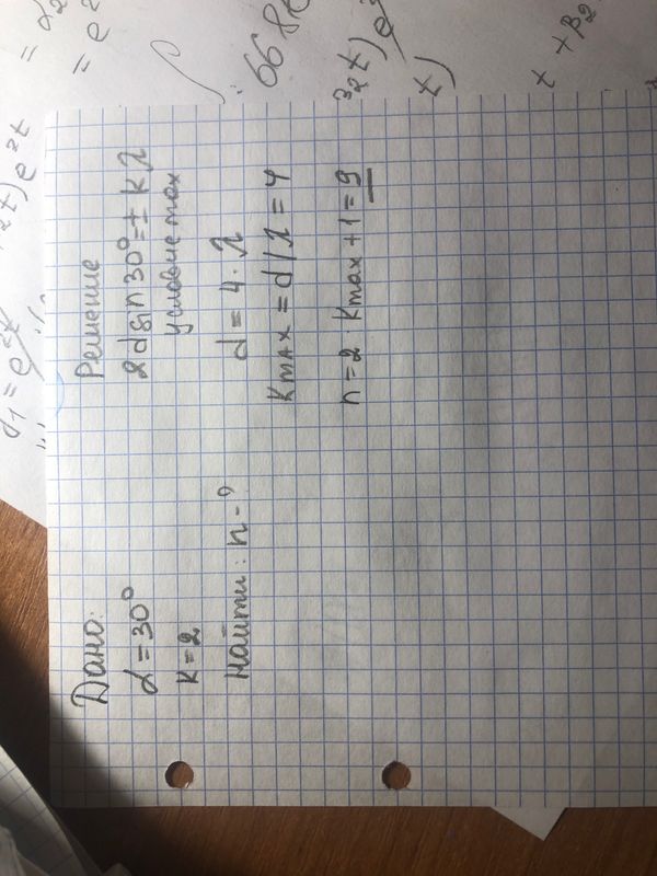 [b]ФИЗИКА(подробно)[/b] При освещении дифракционной решетки светом длиной волны λ , максимум второго порядка наблюдается под углом 30º. Общее число главных максимумов в дифракционной картине равно … 1) 10 2) 9 3) 7 4) 8