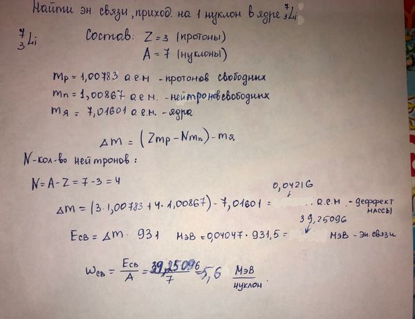 [b]ФИЗИКА ПОДРОБНО[/b] Найдите энергию связи, приходящуюся на один нуклон в ядре 73 [b]Li. [5,6 МэВ][/b]