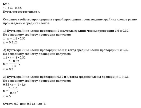 Например 1 / 1,6 = x1 / 0,32 x1 = 0,32*1/1,6 = 0,2 Теперь будет верная пропорция 1 / 1,6 = 0,2 / 0,32 Еще можно x2 = 0,32*1,6 / 1 = 0,512 x3 = 1,6*1/0,32 = 5 Ответ [b]0,2; 0,512; 5[/b]