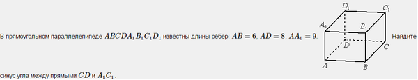 В прямоугольном параллелепипеде ABCDA1B1C1D1 известны длины рёбер: AB=6, AD=8, AA1=9. Найдите синус угла между прямыми CD и A1C1