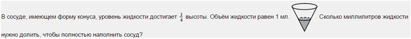 В сосуде, имеющем форму конуса, уровень жидкости достигает 14 высоты. Объём жидкости равен 1 мл. Сколько миллилитров жидкости нужно долить, чтобы полностью наполнить сосуд?