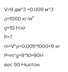 Банка объёмом 3 дм3 заполнена водой. Вычисли вес воды в банке. (Плотность воды ρ=1000 кг/м³, ускорение свободного падения считай равным g=10 Н/кг). Ответ: вес воды — H.
