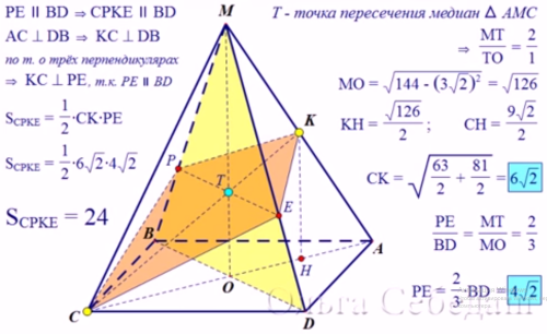 В правильной четырехугольной пирамиде MABCD стороны основания равны 6, а боковые рёбра равны 12. Найти площадь сечения пирамиды плоскостью, проходящей через точку С и середину ребра МА параллельно прямой BD.