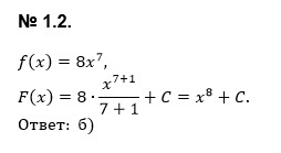 1.2. Найдите общий вид первообразной для функции f(x)=8x⁷. а) F(x)=x⁸/8+C; б) F(x)=x⁸+C; в) F(x)=56x⁶; г) F(x)=56x⁶+C.