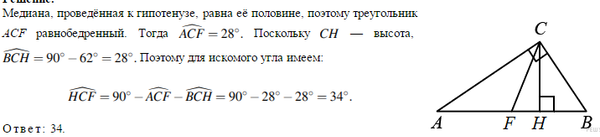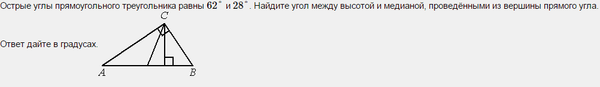 Острые углы прямоугольного треугольника равны 62° и 28°. Найдите угол между высотой и медианой, проведёнными из вершины прямого угла. Ответ дайте в градусах