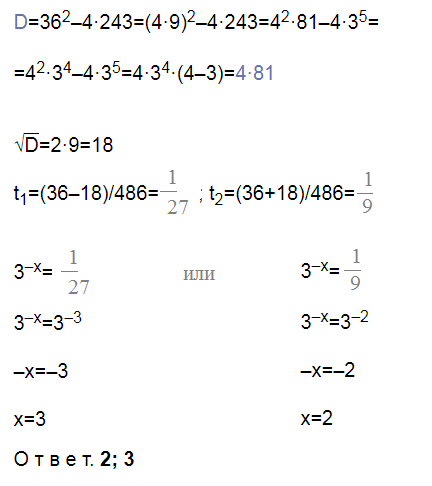 243=3^(-5) 3^(-5)-4*3^(-x)*3^(-3)+(3^(-x))^2=0 Умножаем на 3^(5): 1-36*3^(-x)+243*(3^(-x))^2=0 3^(-x)=t t>0 3^(-2x)=(3^(-x))^2=t^2 Квадратное уравнение: 243t^2-36t+1=0