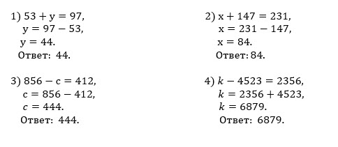 53 + у=97 х+147=231 856-с=412 k-4523=2356