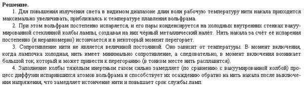 Электрические вакуумные лампы накаливания со спиральной вольфрамовой нитью накала имеют довольно ограниченный срок службы, обычно не превышающий 1000 часов. В процессе длительной работы на внутренней поверхности стеклянной колбы лампы появляется чёрный налёт. Лампы, проработавшие довольно долго, обычно перегорают в момент включения, когда на них подаётся напряжение. Объясните, основываясь на известных физических законах и закономерностях, причину образования налета на стенках колбы и перегорание ламп в момент их включения.