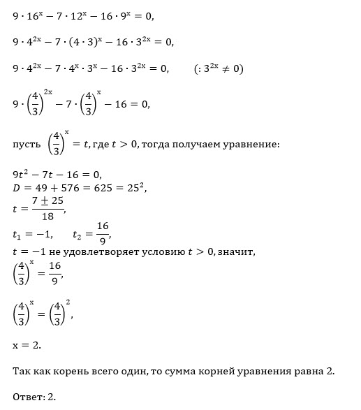 Найдите сумму корней уравнения: 9·16^х - 7·12^х - 16·9^х = 0
