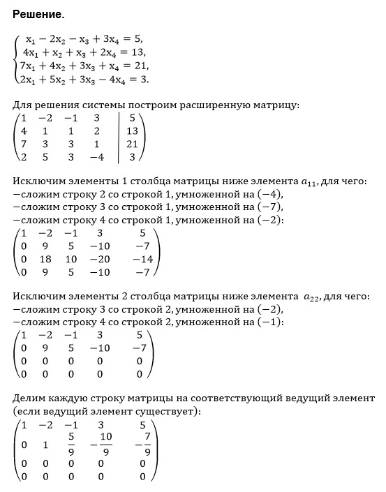 2. Решить систему уравнений методом Гаусса. Указать общее и одно частное решения. { x1 - 2x2 - x3 + 3x4 = 5; 4x1 + x2 + x3 + 2x4 = 13; 7x1 + 4x2 + 3x3 + x4 = 21; 2x1 + 5x2 + 3x3 - 4x4 = 3. }
