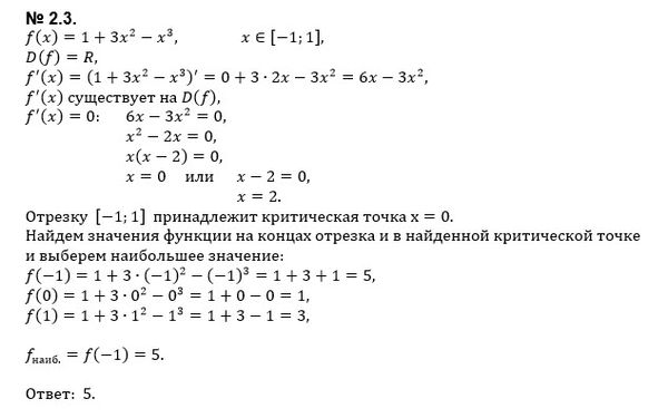 2.3 Чему равно наибольшее значение функции f(x)=1+3x^2-x^3 на промежутке [-1;1]