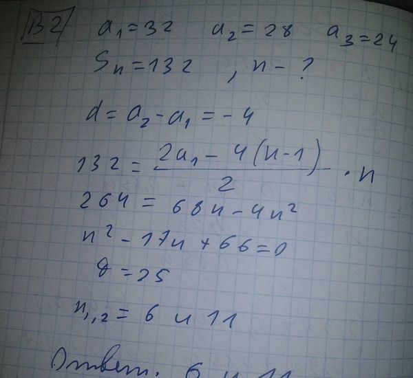 Сколько последовательных членов арифметической прогрессии 32, 28, 24, ..., начиная с первого, надо сложить, чтобы получить сумму, равную 132 ?