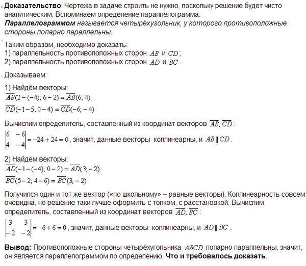 Даны вершины четырёхугольника A(-4,2), B(2,6), C(5,4), D(-1,0). Доказать, что четырёхугольник ABCD является параллелограммом.