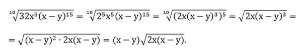 [m]\sqrt[10]{2^5x^5(x-y)^{15}}=\sqrt{2x(x-y)^3}=|x-y|\sqrt{2x(x-y)}[/m] [m]\sqrt[10]{2^5}=2^{\frac{5}{10}}=2^{\frac{1}{2}}=\sqrt{2}[/m] [m]\sqrt[10]{x^5}=x^{\frac{5}{10}}=x^{\frac{1}{2}}=\sqrt{x}[/m] [m]\sqrt[10]{(x-y)^5}=(x-y)^{\frac{15}{10}}=(x-y)^{\frac{3}{2}}=[/m] [m]=|x-y|\sqrt{x-y}=(x-y)\sqrt{x-y}[/m]