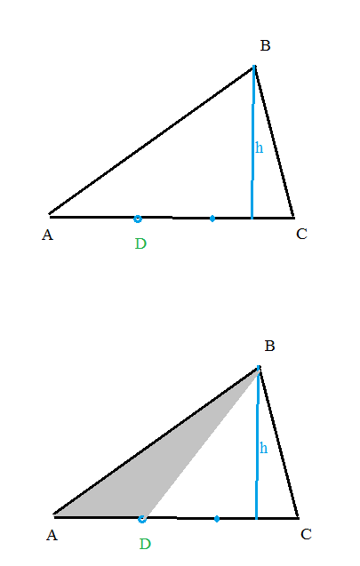 S_( Δ АВС)=(1/2)*AC*h Высота h - общая для Δ АВС и Δ ABD Если AD=AC/3 тогда S_(Δ ABD)=(1/2)AD*h=(1/2)*(AC/3)*h=(1/3)*((1/2)*AC*h)=(1/3)S_( Δ АВС)