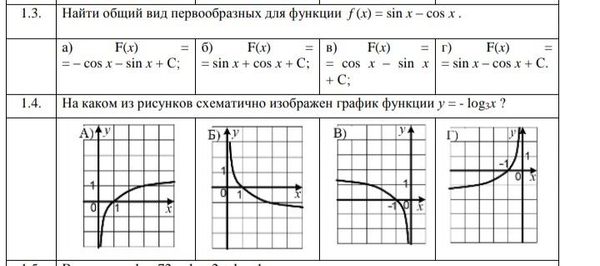1. F(x)=-cosx-sinx+C О т в е т. 1) 2) Функция определена при x>0 Значит график в правой полуплоскости. Остаются два варианта A или Б Функция y=log_(3)x - возрастает, основание 3 > 1 Функция y=-log_(3)x - убывает. О т в ет. Б)