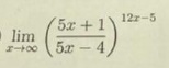 [m]\lim_{x \to\infty}(\frac{5x+1}{5x-4})^{12x-5}=\lim_{x \to\infty}(\frac{5x+1}{5x-4})^{12x}\cdot (\frac{5x+1}{5x-4})^{-5}=[/m]