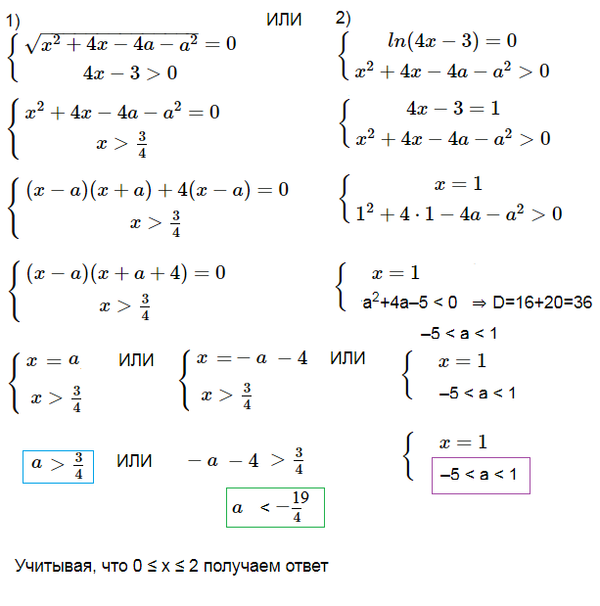 Найти все значения параметра а, при каждом из которых sqrt(x^2+4x-4a-a^2) * ln(4x-3) = 0 имеет ровно один корень на отрезке [0; 2].