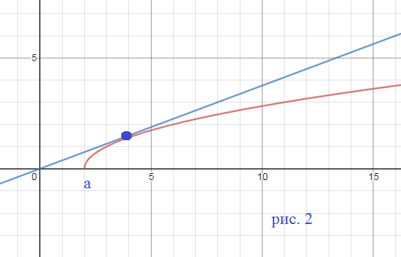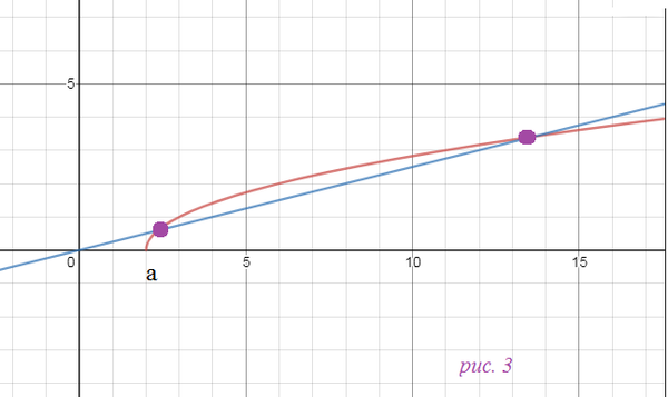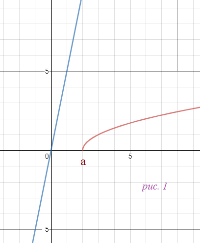Не имеет решений, если прямая y=bx расположена выше графика y=sqrt(x-a) и таким образом графики не пересекаются. как на рис. 1 Одно, если прямая y=bx касается графика y=sqrt(x-a) Два, если прямая пересекается с графиком