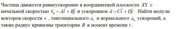 Частица движется равноускоренно в координатной плоскости XY с начальной скоростью v0= Ai + Bj и ускорением a = Ci + Dj . Найти модули векторов скорости v , тангенциального at и нормального an ускорений, а также радиус кривизны траектории R в момент времени t .
