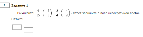 Вычислите: 4/15 * (-5/8) + 3/4 * (-4/9). Ответ запишите в виде несократимой дроби.