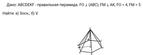 1) Рассмотрим ΔFOM: ∠O = 90° (так как FO ⊥ (ABC), значит, FO ⊥ OM) FO = 4, FM = 5. OM=√( MF^2-FO^2)=√(25-16)=3(по теореме Пифагора), OM = r (r - радиус окружности, вписанной в правильный шестиугольник). AK=2r*tgπ/6=2*3*tgπ/6=6*√3/3=2√3;