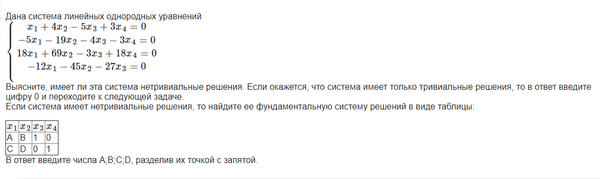 Выясните, имеет ли эта система нетривиальные решения. Если окажется, что система имеет только тривиальные решения, то в ответ введите цифру 0 и переходите к следующей задаче.