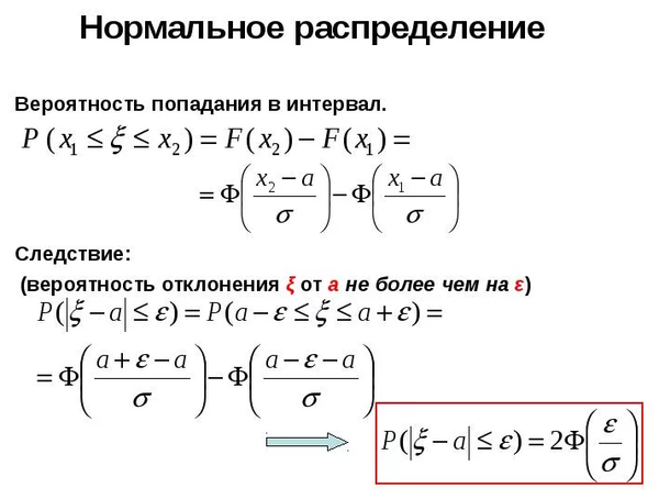 Для случайной величины,распределенной по нормальному закону известны формулы вычисления вероятности попадания случайной величины в интервал [x_(1);x_(2)] и формулы вычисления вероятности отклонения случайной величины от ее математического ожидания