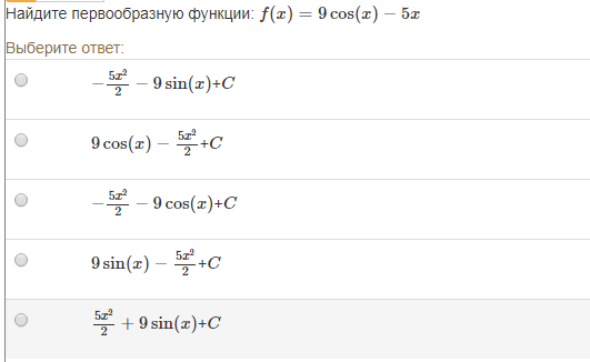 9*(sinx)-5*(x^2/2)+C О т в е т. 4 Можно проверить дифференцированием