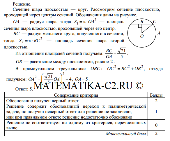 Две параллельные плоскости, расстояние между которыми 2, пересекают шар. Одна из плоскостей проходит через центр шара. Отношение площадей сечений шара этими плоскостями равно 0,84. Найдите радиус шара